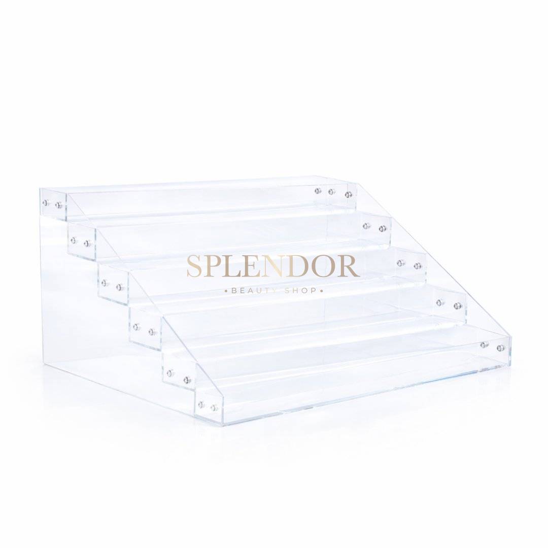 Suport / display produse cosmetice din plexiglass – 6 politeSuportul din plexiglass cu 6 polite este solutia ideala pentru expunerea organizata si vizibila a produselor cosmetice. Conceput pentru a pune in valoare nuantele si produsele, acest display este perfect pentru rujuri, tinturi, oje, geluri UV, vopsele acrilice sau diverse accesorii cosmetice. Datorita structurii sale practice si a celor sase raftulete, suportul permite expunerea clara a numeroase produse. Designul transparent ofera un aspect curat si profesional, integrandu-se usor in orice salon sau spatiu de beauty de acasa. Fabricat din plexiglass rezistent, suportul este stabil, durabil si usor de intretinut, fiind recomandat atat pentru uz profesional, cat si personal. Caracteristici: